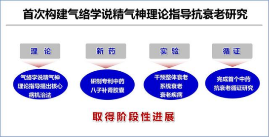 理论创新,首创气络学说精气神理论指导抗衰老研究,提出“肾精虚衰、元气亏虚、形神耗损”衰老核心病机与整体衰老、系统衰老及衰老疾病相关性,揭示衰老机制演变规律、衰老组织器官差异化特征、明确最佳干预时空窗,解析衰老核心病机生物学基础。