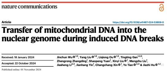 2024年11月1日,北京大学生命科学学院和北大-清华生命科学联合中心胡家志课题组及合作者在Nature Communications发表了标题为“Transfer of mitochondrial DNA into the nuclear genome during induced DNA breaks”的研究论文。该项研究中作者采用实验室前期开发的用于系统分析基因编辑产物的高通量测序方法——PEM-seq5(Cell Discovery | 胡家志研究组开发出优化基因编辑和追踪DNA修复的新方法),发现在核基因组编辑过程中,线粒体DNA片段可能插入到靶向位点,与此同时线粒体DNA的靶向编辑也会引发线粒体DNA的不稳定,导致其插入到核基因组中。作者还发现,通过同时表达DNA外切酶TREX1或TREX2可以降低线粒体DNA插入的频率。这一研究通过研究基因编辑引发的DNA断裂对线粒体DNA的影响,揭示了基因编辑过程中线粒体DNA片段插入核基因组带来的潜在风险并提出了可行的解决思路。