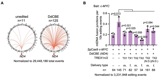 那么由于线粒体基因编辑导致的线粒体DNA碎片是否有可能插入到核基因组中呢?作者利用PEM-seq发现,在mitoTALEN编辑后线粒体DNA与核基因组整合序列的断点大多发生在mitoTALEN的编辑窗口内。同样的,在DdCBE编辑后也能发现编辑位点与核基因组的整合,证明线粒体编辑器同样可以导致线粒体DNA插入到核基因组中(图1A)。在细胞中核酸外切酶TREX1和TREX2会清除细胞质中游离的DNA片段从而避免细胞炎症反应的过度激活6。作者发现,在编辑过程中同时表达TREX1或TREX2可以显著降低编辑过程中线粒体DNA的插入(图1B),为解决这一编辑安全隐患提出了解决的思路。