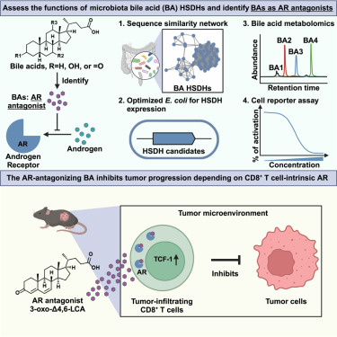 威尔康奈尔医学院研究人员领导的一项临床前研究表明,人类肠道中天然存在的细菌(称为肠道菌群)可以将胆固醇衍生的胆汁酸转化为强大的代谢产物,从而通过阻断雄激素信号传导来自增强抗癌免疫力。相关研究结果发表在Cell杂志上。
