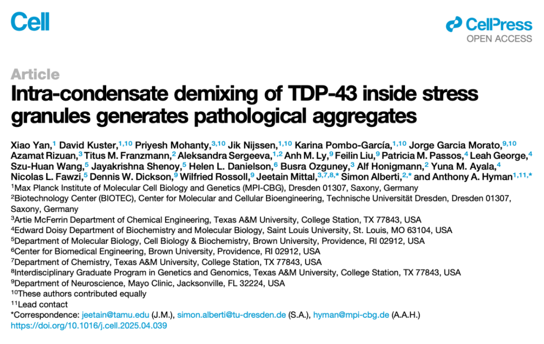 2025 年 5 月 23日,马克斯·普朗克分子细胞生物学与遗传学研究所(MPI-CBG) Anthony Hyman 团队(博士后闫啸等人为第一作者)在国际顶尖学术期刊 Cell 上发表了题为:Intra-condensate demixing of TDP-43 inside stress granules generates pathological aggregates 的研究论文。