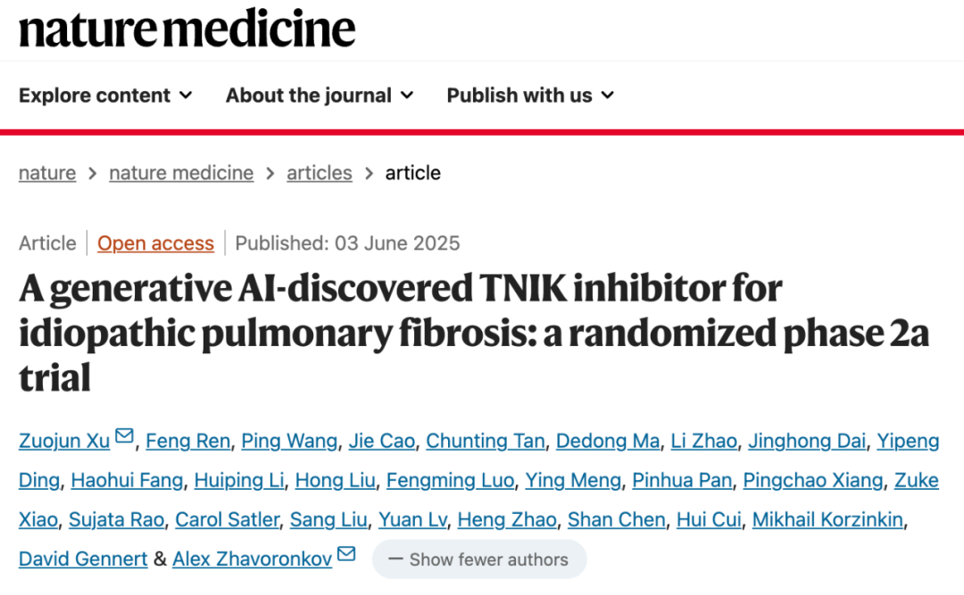 2025 年 6 月 3 日,英矽智能(Insilico Medicine)联合北京协和医院徐作军教授团队,在国际顶尖医学期刊 Nature Medicine 发布了题为:A generative AI-discovered TNIK inhibitor for idiopathic pulmonary fibrosis: a randomized phase 2a trial 的研究论文。