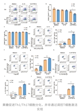 这些尝到「甜头」的小鼠血清中果糖含量飙升,原本该保持平衡的T细胞开始「站队」。在结肠、脾脏、肠系膜淋巴结和肝脏中,Th1和Th17这些促炎型细胞比例明显增多;但负责调节和平息炎症的Tr1、Th2和Treg却几乎没变。这意味着,果糖不是无差别让免疫系统「乱作一团」,而是精准地给促炎通路踩下了「油门」,埋下之后肠道炎症的隐患。