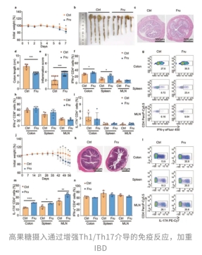 那这股「果糖助燃」到底能把炎症推到什么程度?研究者开始上模型。他们首先在硫酸葡聚糖钠(DSS)诱导的结肠炎小鼠模型中发现,饮用普通水的对照组小鼠结肠长度基本维持在正常范围,炎症评分较低,结肠和脾脏内的Th1细胞仅处于基础激活状态,整体肠道免疫环境相对稳定。相比之下,高果糖组小鼠肠道炎症被显著放大。它们结肠明显缩短,炎症评分显著升高,同时结肠和脾脏中Th1细胞比例同步上升。换言之,高果糖进一步推高了Th1细胞介导的促炎反应,使原本已受损的肠道炎症状态持续恶化。