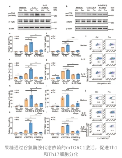 有了这个线索,研究者进一步追踪下游信号通路,发现果糖通过增强谷氨酰胺代谢,激活了mTORC1信号,从而推动Th1和Th17细胞分化。当他们加入mTORC1抑制剂雷帕霉素,这种果糖带来的促炎效应就被彻底抑制了。