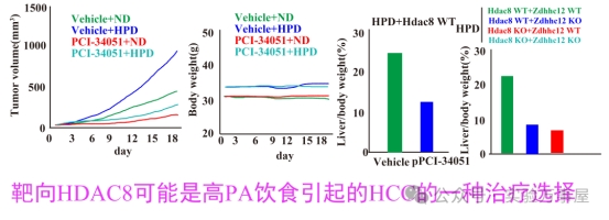 HDAC8的C244残基棕榈酰化位点抑制,也就是C244S突变后,则加大了HDAC8与溶酶体的共定位,这就说明了HDAC8的棕榈酰化,对于HDAC8的CMA降解可能起到了重要的作用。接着他们通过靶向敲除HDAC8,分析了对于高脂饮食导致的HCC所产生的影响。通过体内实验,确定了靶向HDAC8可能是由于高PA饮食引起的HCC的一种治疗选择: