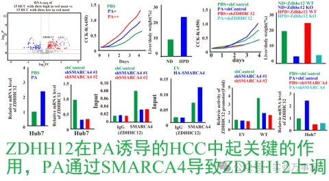 研究者通过MR(孟德尔随机)分析,确定了SFA(饱和脂肪酸)暴露与HCC(肝细胞癌)之间的关联性(其实这也就是一种归纳法中米勒五法的求同法分析,通过MR找出SFA摄入与HCC之间的潜在关联性,从而展开之后的研究,归纳法不但是通过归纳统计找出关联性的关键,同时也是通过这样的关联性提出科学假设的关键,不清楚归纳法和米勒五法,以及假设提出的话,可以去看看《科研的推理和逻辑》、《列文虎克读文献》和《信号通路是什么鬼?》系列)。而最常见的SFA就是类似PA(棕榈酸)这样的脂肪酸,而PA在体内通过代谢形成棕榈酰CoA,就会对于蛋白进行棕榈酰修饰。于是他们就假设棕榈酰转移酶是否能与HCC有关,通过分析后,他们发现ZDHHC12是在HCC中较高表达的棕榈酰转移酶,通过皮下移植瘤实验,他们发现敲减ZDHHC12可以有效抑制高脂饮食对肿瘤的促进作用,也就说明ZDHHC12在PA诱导的HCC中可能起到了关键作用: