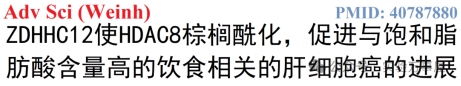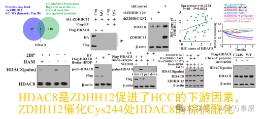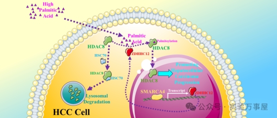 最后就形成了这样的示意图,差不多就是高PA环境下,SMARCA4促进了ZDHHC12的转录,而ZDHHC12可以诱导HDAC8的C244残基棕榈酰化,从而避免HDAC8结合HSC70,避免了HDAC8的CMA介导的溶酶体降解。HDAC8的棕榈酰化引发的其稳定性增强,促进了HCC肿瘤的进展