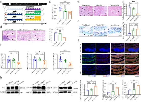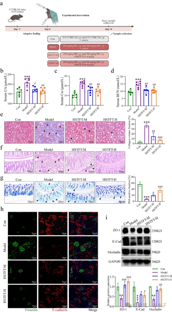 HSTFT 能减轻HUA小鼠的肾纤维化现象,并改善其肾脏功能,同时还能保护其肠道屏障。