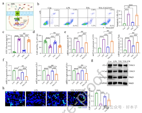 分子对接结合药理抑制实验发现,TOL通过激活AhR信号级联反应,发挥细胞保护、抗凋亡和抗炎的作用。AhR 的激活会增强上皮连接基因的转录,维持屏障的完整性,并抑制炎症细胞因子的产生,从而在有害条件下维持黏膜的稳态。抑制 AhR 的药理作用则完全消除了这些益处,证实了 AhR 是 TOL 维持肠道上皮稳定性和免疫平衡的关键分子靶点。