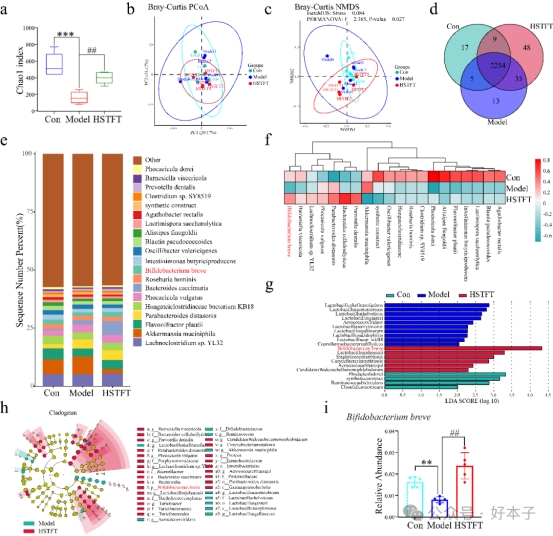 HSTFT 改变了肠道微生物群的组成,增加微生物的多样性,并提高了HUA小鼠体内有益菌(如B.breve)的含量。