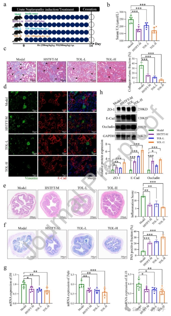 TOL能够有效地模拟 HSTFT 的治疗效果,减轻肾纤维化,保护肾小管上皮结构,并恢复肠道屏障功能。TOL能够抑制炎症并强化上皮连接,从而重建肠道与肾脏之间的平衡,并减轻HUA引起的肾脏损伤。