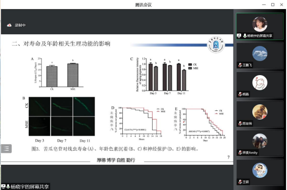 这次会议分别对《乙醇减轻秀丽隐杆线虫阿尔兹海默病模型中β-淀粉样蛋白诱导的毒性》、《苦瓜皂苷降脂小综述》、《拟青霉素提取物通过skn-1增加秀丽隐杆线虫的寿命并保护其免受氧化应激,而不是daf-16》、和《DEHP诱导的秀丽隐杆线虫的生殖毒性与DNA损伤依赖性的卵母细胞凋亡和氧化应激有关》四篇文献进行了学习,分别由陈清怡、杨晓宇、金蓦然以及胡天乐四名同学对文献的研究方法和研究结果进行了讲解,各位同学就文献中的实验方法以及结果进行了积极提问和讨论。会议期间,屈长青教授对各位同学的汇报进行了点评以及指正。最后,屈长青教授以及杨京霞老师对会议作了总结。