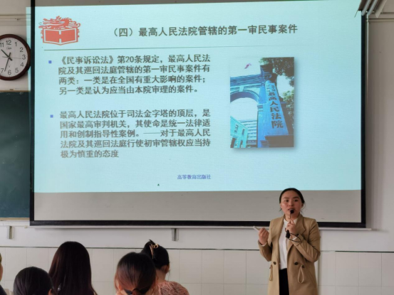 授课教师卢秀云基于主管的案件类型对于法院级别管辖进行介绍,重点讲解了中级人民法院受理第一审民事案件的类型,从立法角度向学生介绍四级法院的分工,帮助学生理解掌握级别管辖的内容。
