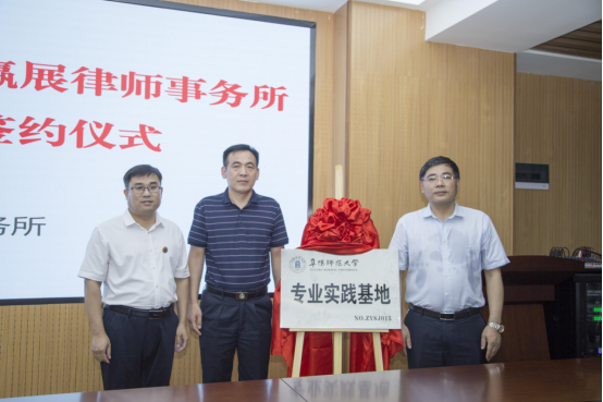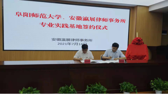 2021年7月14日,法学院与安徽瀛展律师事务所举行专业实践基地的签约和授牌仪式。出席仪式的有法学院党委副书记、院长余为青,临泉县司法局副局长水东、于亮,安徽瀛展律师事务所主任骆东升,一同参加仪式的还有法学院公法教研室主任李永成博士、陈元庆博士、王磊博士、王少杰老师和安徽瀛展律师事务所全体律师。