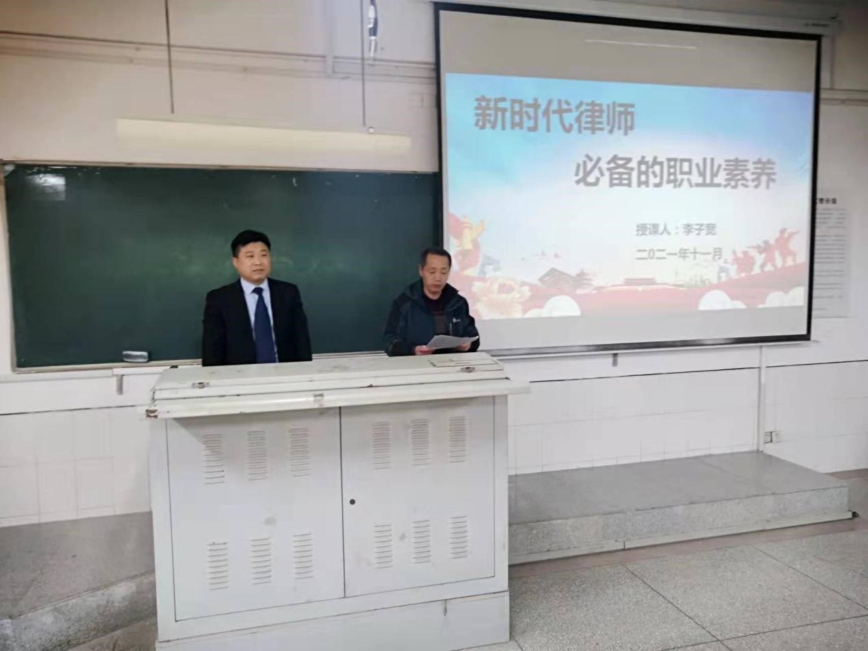为扎实开展本科生专业见习,深入推动各门法律课程的实践教学,进一步增强学生专业认知和实践能力,11月26日下午,法学院诚邀安徽志豪律师事务所主任、阜阳市政府法律顾问李子宽律师为法学专业师生作题为《新时代律师必备的职业素养》的专题讲座。讲座由法学院党委书记钱守云主持,法学院法律系主任李永成博士、陈元庆博士、王磊博士、简洪利老师、王少杰老师和部分法学专业学生参加了讲座。