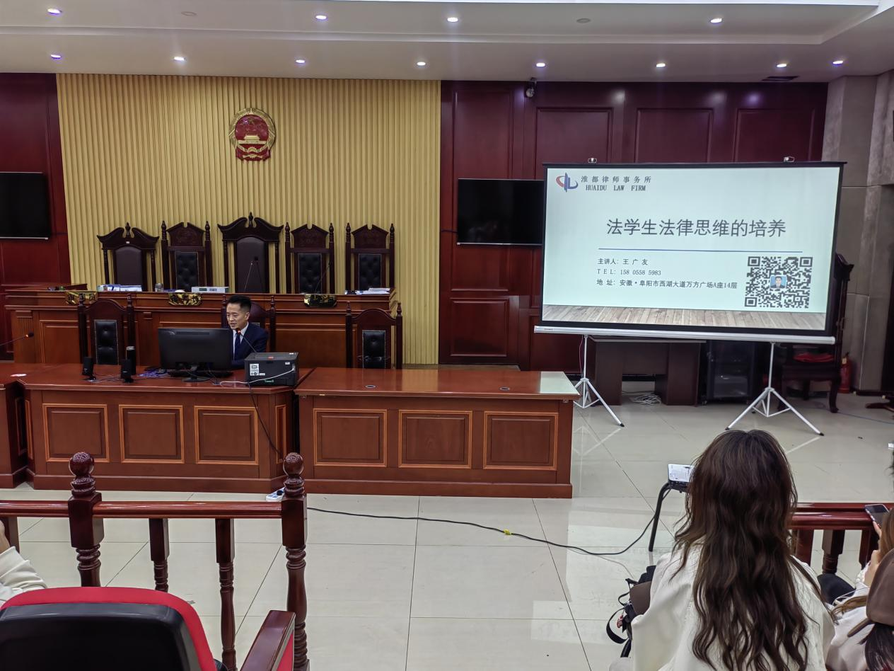 2023年11月23日,安徽淮都律师事务所主任王广友律师受邀来到阜阳师范大学西湖校区,为我院师生带来了以《法学生法律思维的培养》为题的学术讲座。法学院班子成员、部分教师与2021级、2022级3班4班的全体同学参加了讲座。本次讲座由法学院院长余为青教授主持,覃业坤博士点评。
