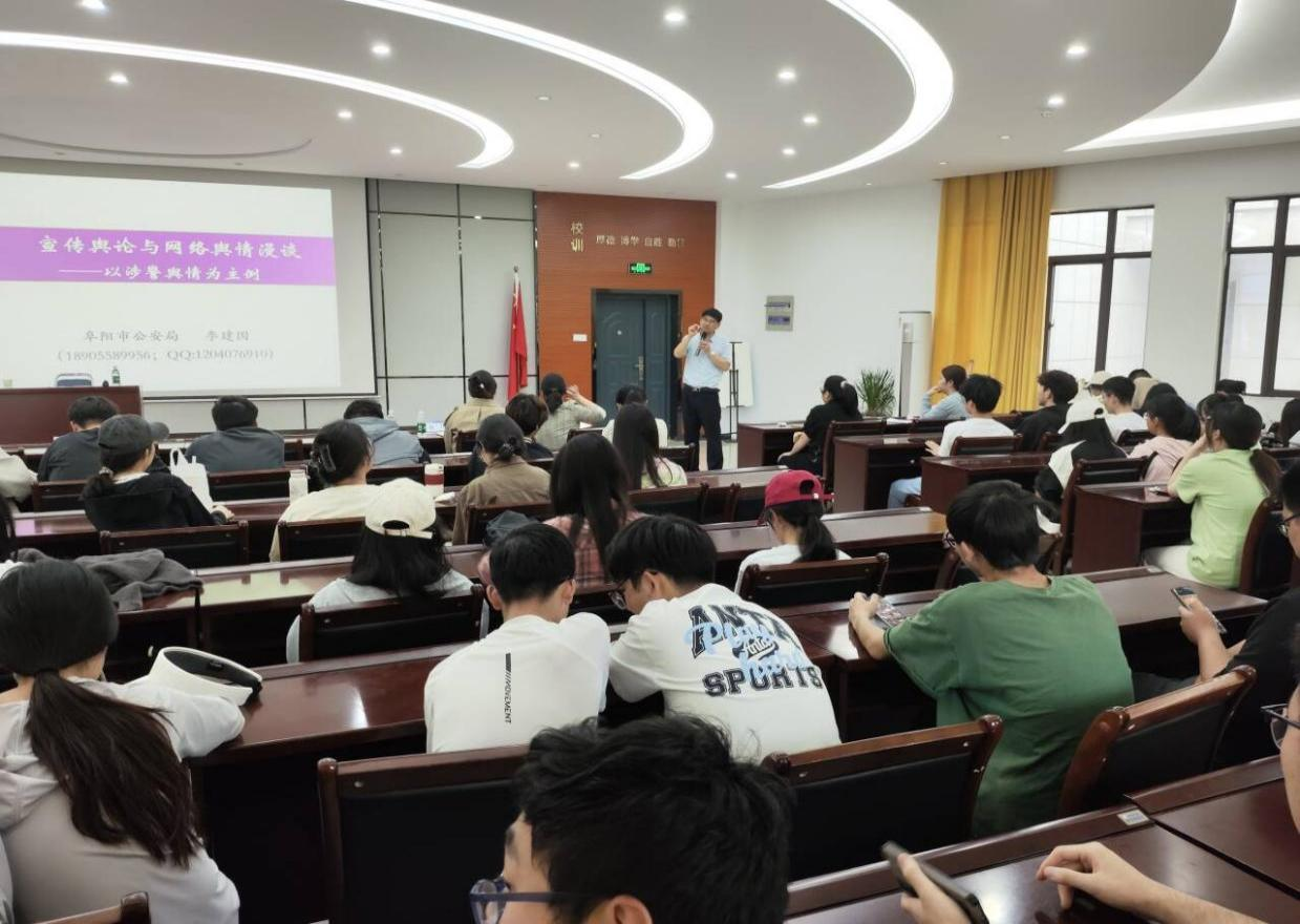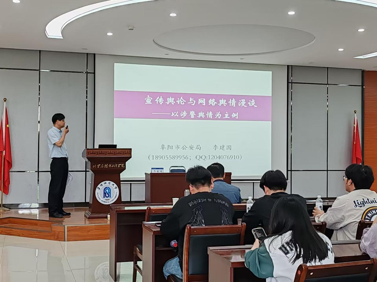 为加深大学生关于网络舆情的认识,了解政府网络舆情应对方法,法学院管理教研室特别邀请阜阳市公安局宣传科科长、一级警长李建国于2024年4月25日下午15:00,在新化工楼二楼圆形报告厅讲述了以“政府舆情应对漫谈”为题的实务讲座。本次活动面向2021级、2022级、2023级行政管理专业学生和2021级公共事业管理专业学生。出席本次讲座的有管理教研室老师冯伟、伲永贵和杨琦。