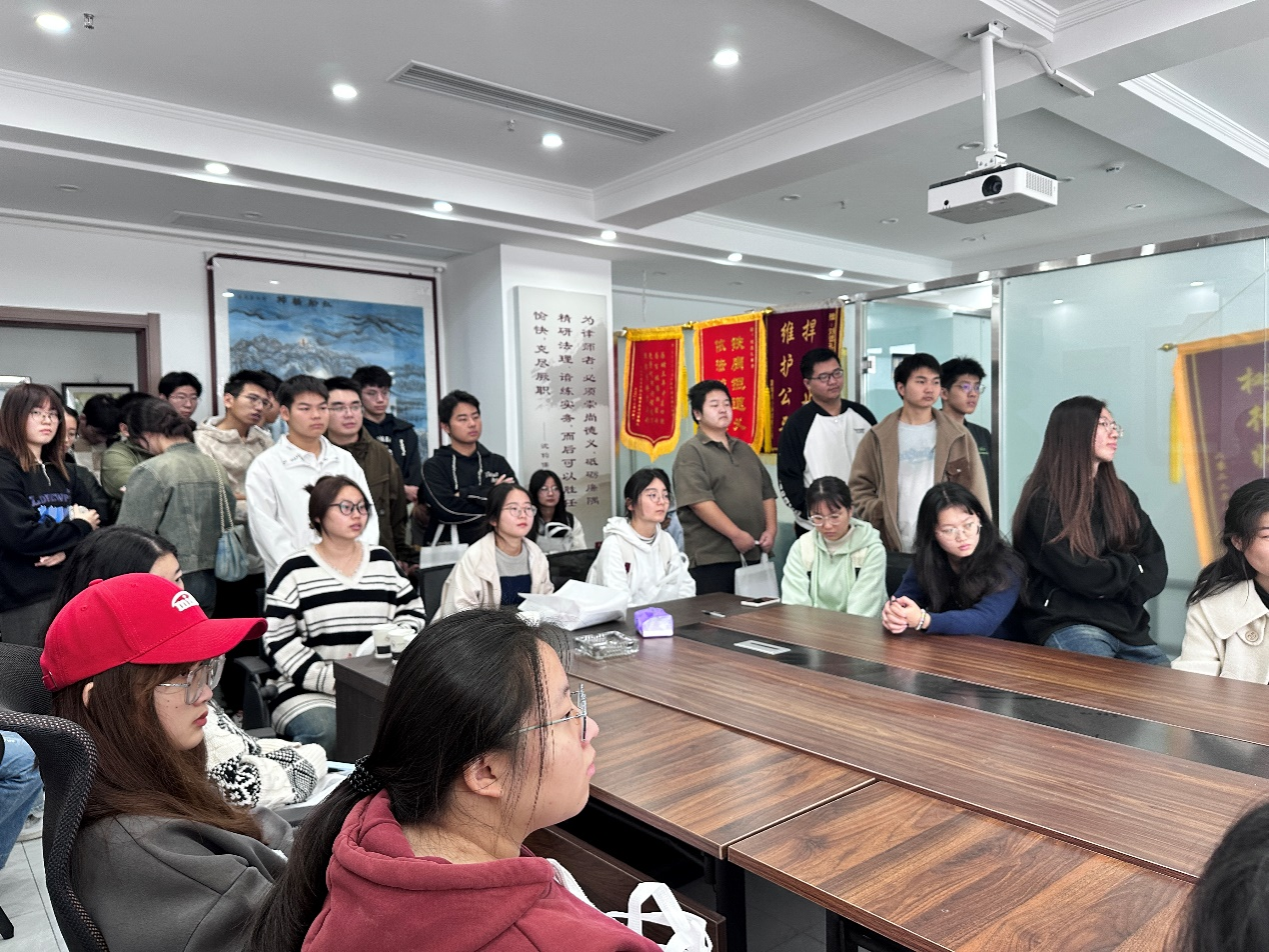 随后,在工作人员的带领下,同学们参观了乾震律师事务所的办公场所,包括党建活动室、文体活动室、当事人接待室、律师办公区、档案室等区域。通过参观,同学们对律师事务所的办公环境、工作流程和文化氛围有了更直观的了解。