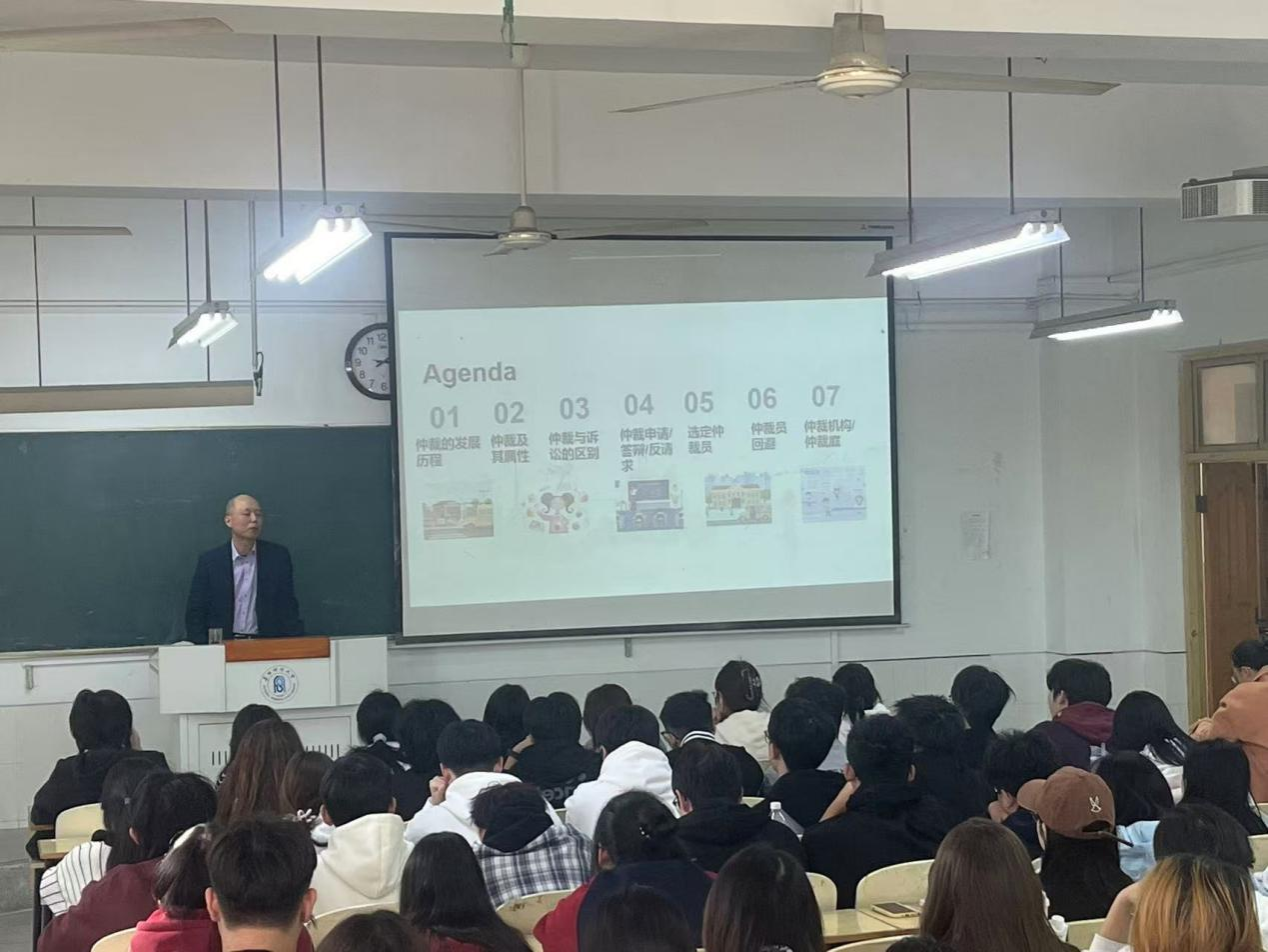蒋曙光律师首先介绍了《仲裁法》发展历程,提出在整个法律体系中,《仲裁法》作为重要的非诉讼程序法,与民事诉讼法有着明显区别。他结合《仲裁法》的修订情况,就仲裁概况、仲裁的优势特点、仲裁流程以及仲裁实务等内容进行了详细讲解。讲座内容能够融合具体案例和自身办理仲裁案件的体会、感悟,形象生动,切合实际,可操作性强,不仅加深学生们对于仲裁知识的理解,还大大激发了学生们对于仲裁的兴趣。