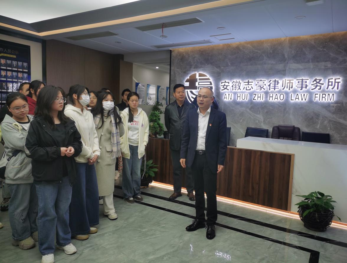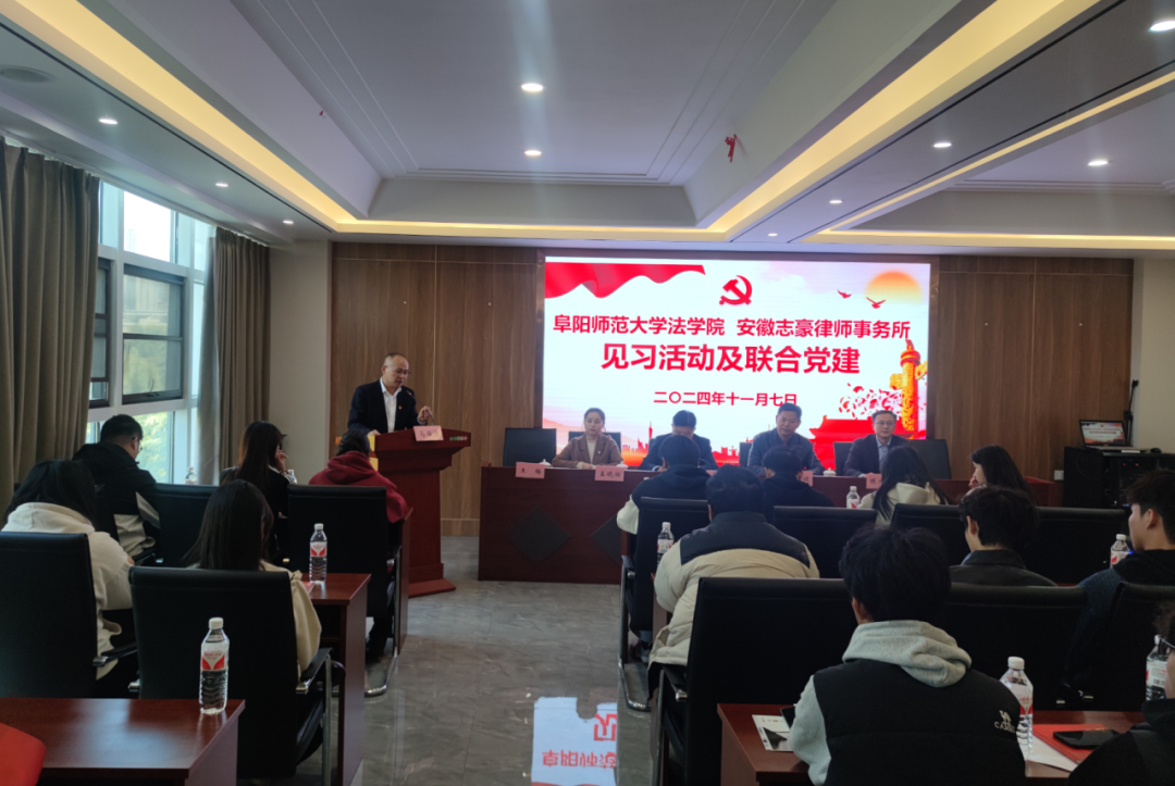 为深化院所之间的交流与合作,提升法科生对法律实务、法律职业的了解,增强法律职业认同,2024年11月7日上午,阜阳师范大学法学院党委书记马健、民商法教研室主任陈元庆博士、孟晓丽博士及法学院50余名本科生,赴安徽志豪律师事务所开展专业见习及联合党建活动。安徽志豪律师事务所党支部书记、执行合伙人李子宽主任、合伙人韩洪立主任等陪同参加,活动由合伙人马后清主任主持。