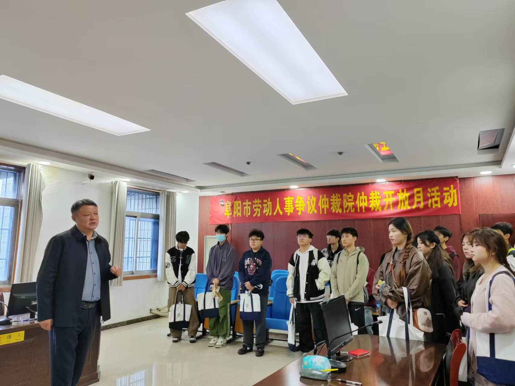 阜阳市劳动人事争议仲裁院的院长韦黎辉亲自带领师生们参观了调解室、仲裁庭等关键工作区域,详细介绍了“调解仲裁+高质量就业+技能培训”联动服务机制的运作方式。在调解室,师生们了解到了仲裁院如何高效解决劳动人事争议,节省双方的时间与精力成本。仲裁院通过在立案前开展调解工作,大大提升了调解效率,缩短了案件处理时间。仲裁庭的参观则让学生们亲眼见证了仲裁案件的审理流程,对仲裁工作有了更为直观的认识。此外,师生们还参观了仲裁员的办公室,墙上挂满了当事人送来的锦旗,这些锦旗不仅是对仲裁院工作的认可,也是对仲裁员专业精神和公正裁决的肯定。