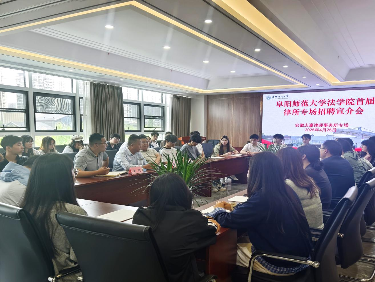 见习期间,还开展了阜阳师范大学法学院首届律所专场招聘宣介会。韩宪生和韩洪立两位主任详细介绍了安徽志豪律师事务所的业务范围、发展前景、招聘需求以及人才培育机制等内容,为有意向加入律所实习或就业的学生提供了详细资讯。现场学生们积极与招聘人员深入交流,为自己的职业发展迈出了坚实一步。