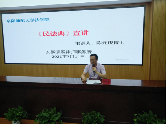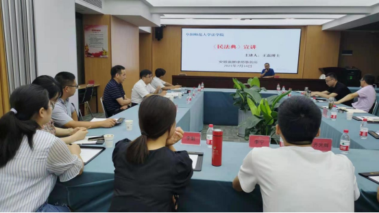 为响应中共安徽省委宣传部、中共安徽省委网信办、安徽省人大常委会监察和司法工委、安徽省高级人民法院、安徽省人民检察院、安徽省教育厅等10部门印发的《全省“美好生活·民法典相伴”主题宣传实施方案》中关于宣传《民法典》的号召,2021年7月14日下午,法学院党委副书记、院长余为青教授、公法教研室主任李永成博士,陈元庆博士、王磊博士和王少杰老师,在临泉县晶宫广场8号楼16层1608会议室宣传《民法典》。参加宣讲活动的有临泉县政府部门工作人员、律师代表和其他各界人士。