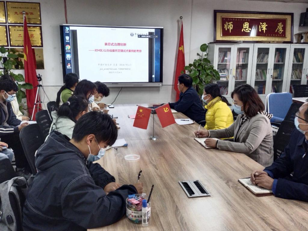 2022年11月24日上午九点,法学院管理教研室邀请了中国矿业大学马克思主义学院王勇教授,在景行楼812会议室举办了题为“表意式治理创新——对H区J公办园委托管理试点案例的考察”的学术报告。由于疫情原因,本次学术报告会采取线上腾讯会议方式,法学院管理教研室老师和行政管理专业学生采取线下与线上相结合的方式聆听了本次报告。