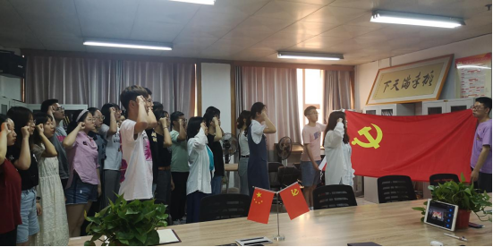 随后,项亚萍向以上二十位同志分发党徽,支部全体党员同志举起右手,面向党旗庄严宣誓。