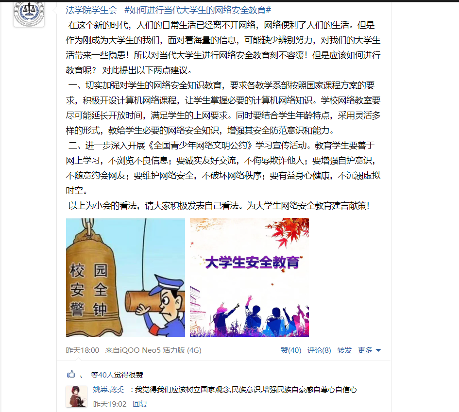 学院围绕2021年国家网络安全宣传周、《中华人民共和国网络安全法》及相关法规主题内容开展线上宣传活动,通过院学生会官微等渠道发布相关专题信息,旨在帮助师生提升网络安全意识和防护技能。另外,法学院还通过组织学生参与网络安全知识学习、网络安全知识竞答、制作《网络安全宣传手册》等形式,向师生广泛宣传网络安全法、个人信息保护技能等知识。