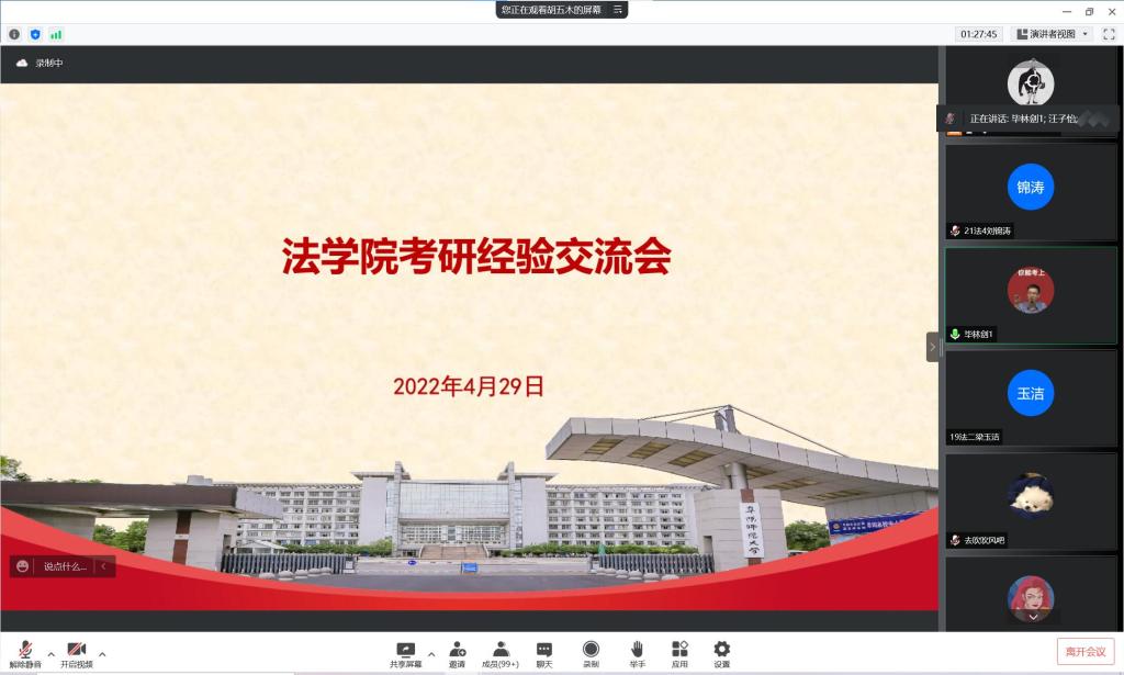 为了帮助同学们进行更好的人生规划,明确考研、法考目标,掌握相关应试技巧,法学院分别于4月29日和4月30日相继举办了考研和法考线上经验交流会。交流会邀请了2018级考研成功或者通过司法从业资格证的同学分享考试经验和心得,法学院全体学生参加会议。