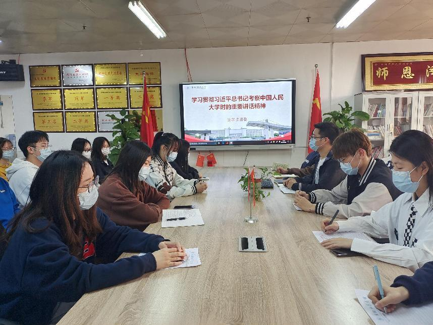 与会人员集中观看了相关视频新闻,李阿康向同学们传达了习近平总书记考察中国人民大学时的重要讲话精神。