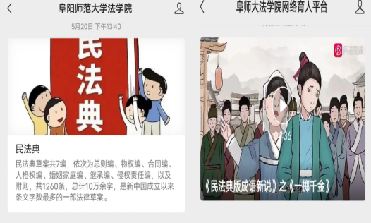 《民法典》微信推送。坚持线上线下同频共振,不断拓展网络宣传维度和学习外延。法学院充分利用网络平台,在微信公众号积极主动宣传民法典。