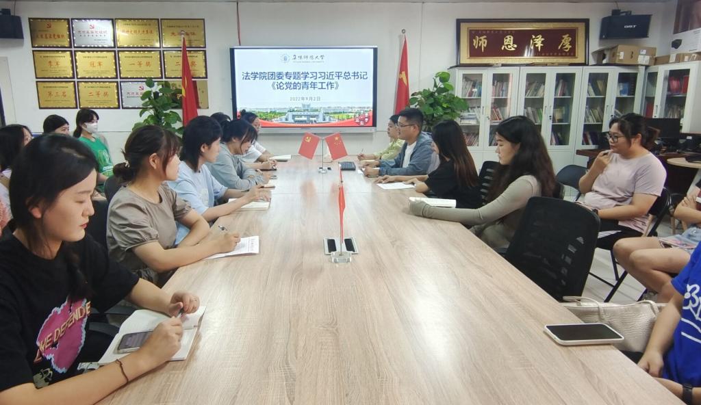 为了深入学习贯彻习近平总书记关于青年工作的重要思想,根据校团委工作安排,2022年9月2日,法学院团委在景行楼812会议室召开专题学习会,集体学习习近平总书记《论党的青年工作》。学院团学负责人李阿康、各班团支书以及团员青年代表参加会议。会议由李阿康主持。
