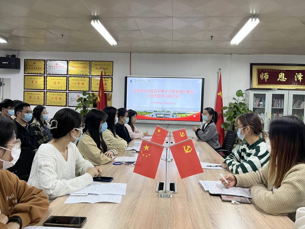 为深入学习贯彻党的二十大精神,进一步提高党员发展对象的政治理论水平和党性修养,端正入党动机,坚定为共产主义事业奋斗终身的信念,11月8日,法学院分党校第十六期党员发展对象培训班学员围绕“学思践悟强信念 砥砺奋进新征程”这一主题展开了研讨。法学院分党校第十六期发展对象培训班全体学员参加研讨会,本次会议由法学院党委秘书王楠主持。