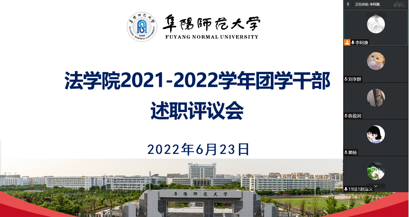 6月23日,法学院团委线上举办了2021-2022学年学院团学干部述职评议会,法学院团学负责人李阿康、各班团干部以及学生会组织负责人参加会议。