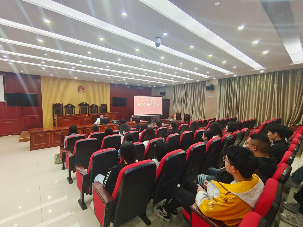 为深入学习宣传贯彻党的二十大精神,深刻领会把握党的二十大精神的丰富内涵,3月10日,校团委青年讲师团成员、教育学院团委负责人张思奇应邀到我院宣讲党的二十大精神,法学院团委负责人李阿康主持宣讲会。