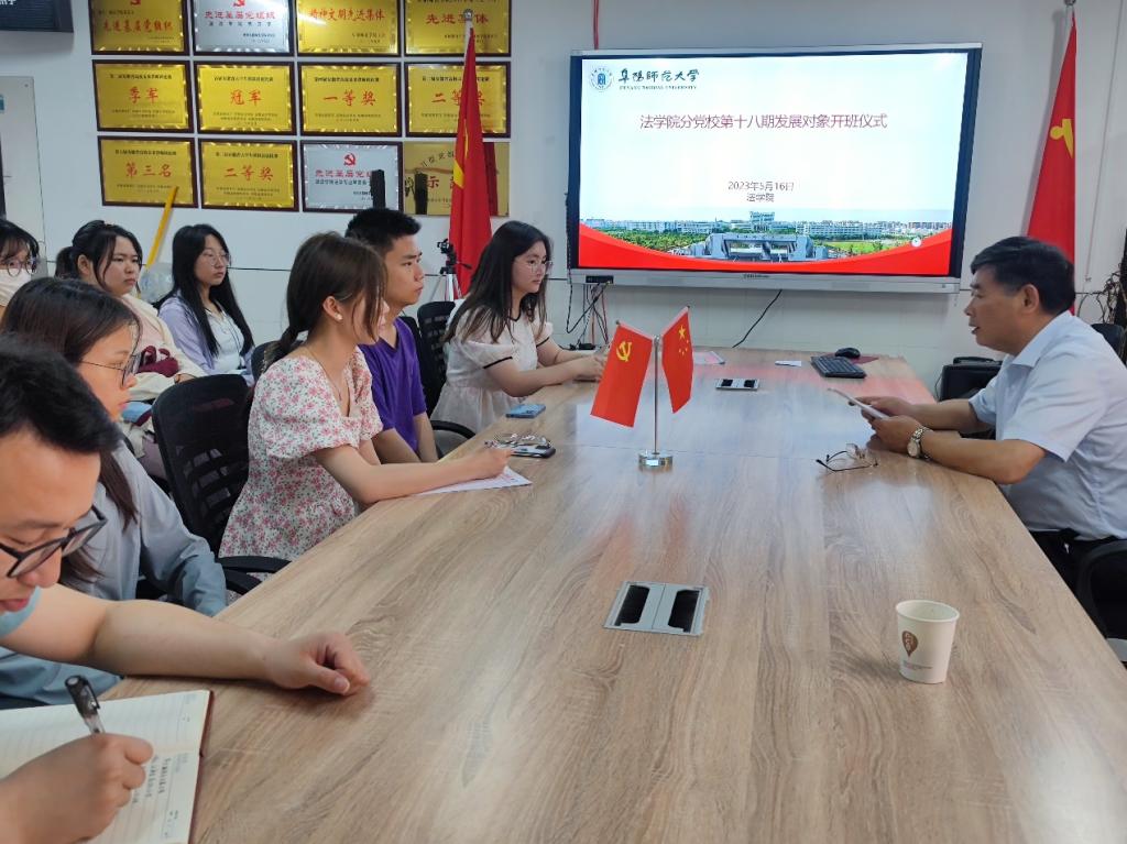 为在青年学生中深入学习宣传贯彻党的二十大精神,切实做好发展党员工作,进一步强化发展对象的理论素养,提升新发展党员的质量,法学院党委于5月16日举行了第十八期党员发展对象培训班开班仪式。法学院党委副书记、院长余为青出席开班仪式并讲话。