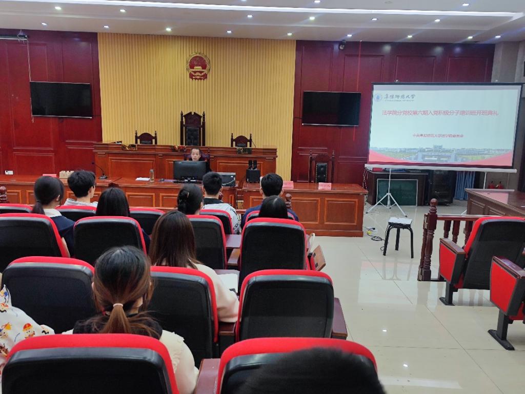 为深入学习贯彻党的二十大精神,帮助入党积极分子更加深刻领悟“两个确立”的决定性意义,更加自觉增强“四个意识”、坚定“四个自信”、做到“两个维护”,始终在思想上政治上行动上同以习近平同志为核心的党中央保持高度一致,4月25日,法学院在景行楼模拟法庭举行第六期积极分子培训班开班典礼暨开班第一课,法学院党委书记钱守云、相关班级辅导员及法学院2023年春季全体入党积极分子参加。