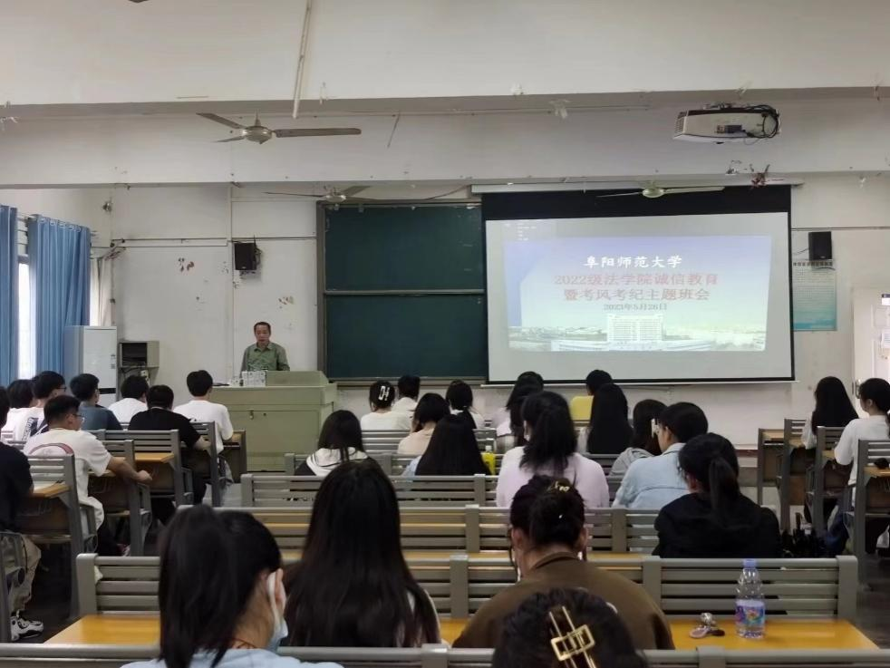 2022-2023春季学期期末考试在即,为加强大学生学风建设、考风考纪和诚信教育,促进大学生养成诚信意识,5月30日,法学院党委书记钱守云走进教室向大学生开展考风诚信教育主题宣讲会。