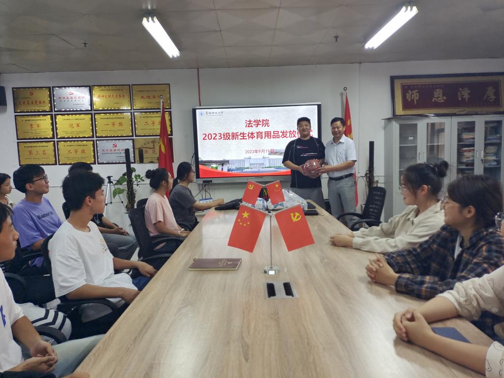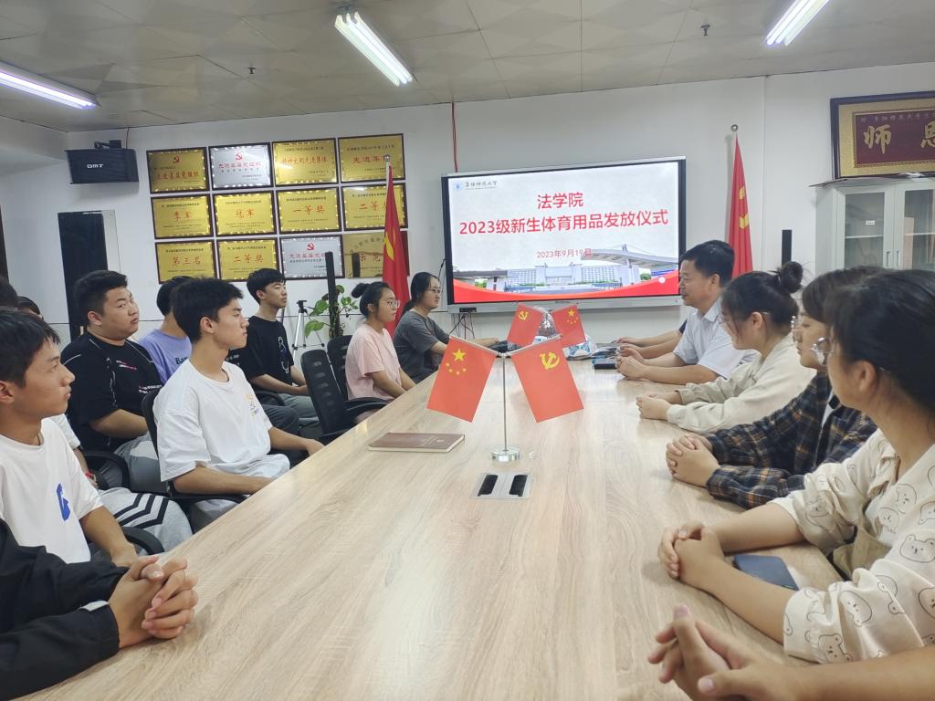 为丰富我院学生的课余生活,鼓励学生积极参与体育锻炼,从而增强身体素质。9月19日,法学院在景行楼812会议室举行2023级新生体育运动用品发放仪式,院党委书记马健、团学负责人李阿康、组织员胡五木以及新生代表近30人参加。