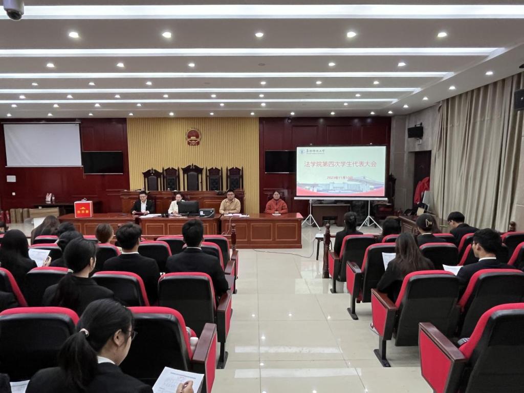为全面学习宣传贯彻党的二十大精神,落实落细学生会组织深化改革要求,更好地团结带领广大青年学生奋进新征程、建功新时代,11月10日,法学院第四次学生代表大会在西湖校区景行楼模拟法庭召开,法学院党委副书记李阳、党委秘书王楠以及组织员胡五木出席会议,法学院各年级学生代表共计51人参加大会,会议由院团委负责人李阿康主持。