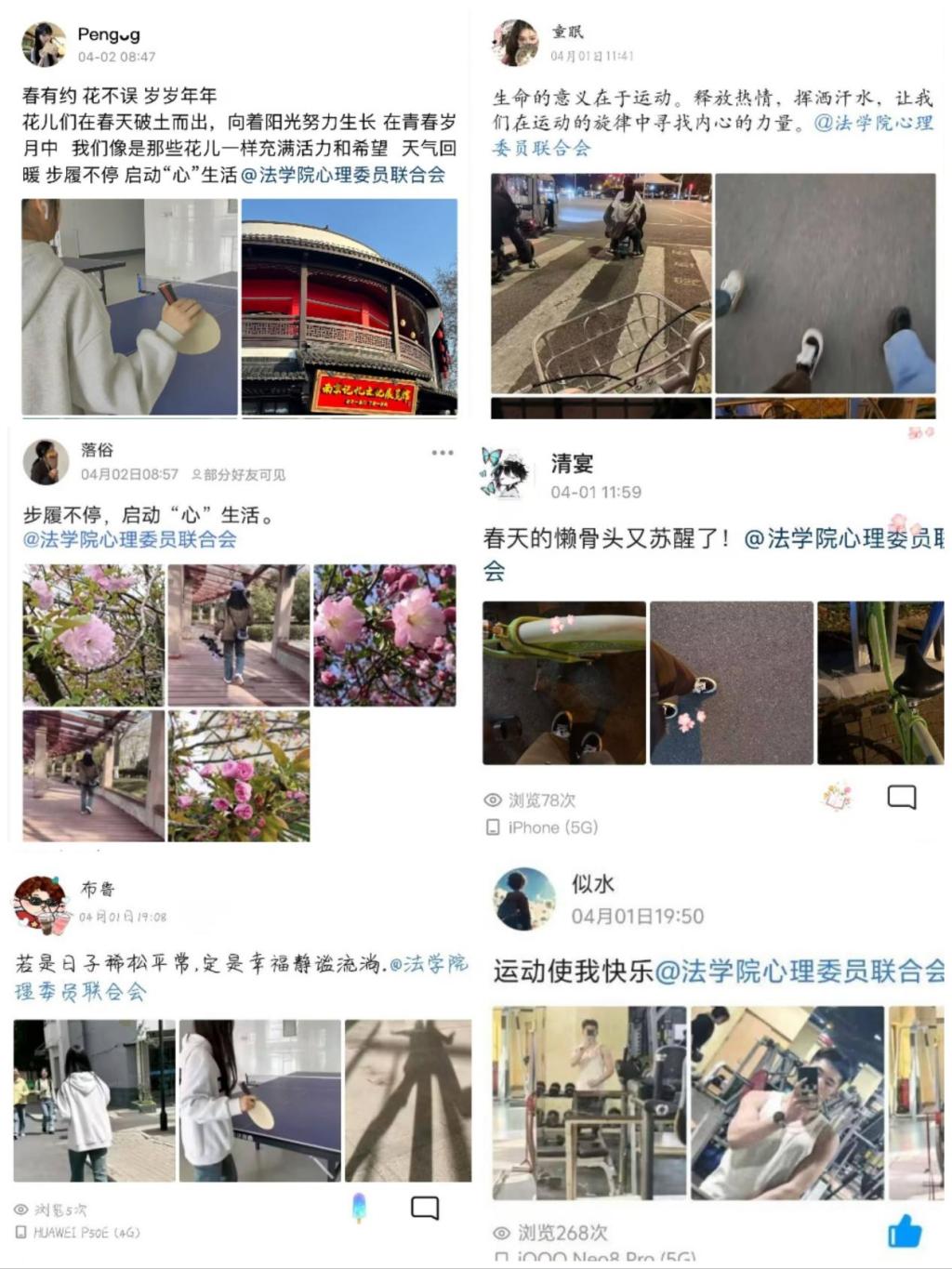 开展“阳光随心,运动随行”春季运动打卡活动。4月1日至4月10日,同学们分享自己每日运动锻炼的照片并艾特法学院心理委员联合会官Q的方式进行运动打卡,用镜头记录活力生活,通过运动增强自身体质,调整释放情绪的同时带动身边同学参与运动,营造学院健康向上的良好氛围。