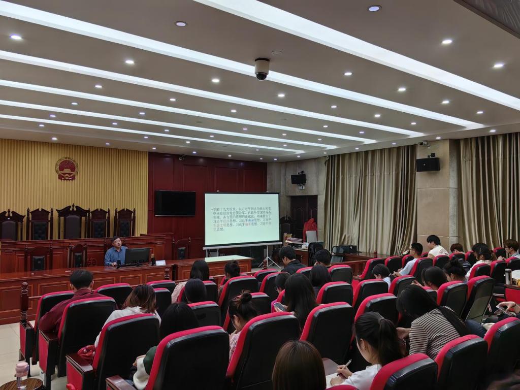 为全面贯彻党的二十大精神,提高青年法治思想教育,引导青年深刻认识我国社会主义法治的本质特征,4月16日下午,法学院院长余为青在模拟法庭进行第七期入党积极分子培训班专题授课。