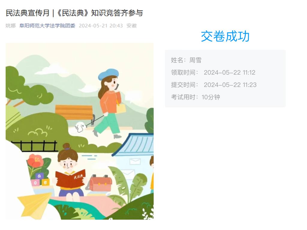 组织《民法典》知识竞赛齐参与。为增强学生学法守法意识,提升学生法律素养,激发学生学习法律的积极性,5月以来,法学院积极组织师生参与中国普法微信公众号民法典专项答题活动以及我院开展的《民法典》知识竞赛。
