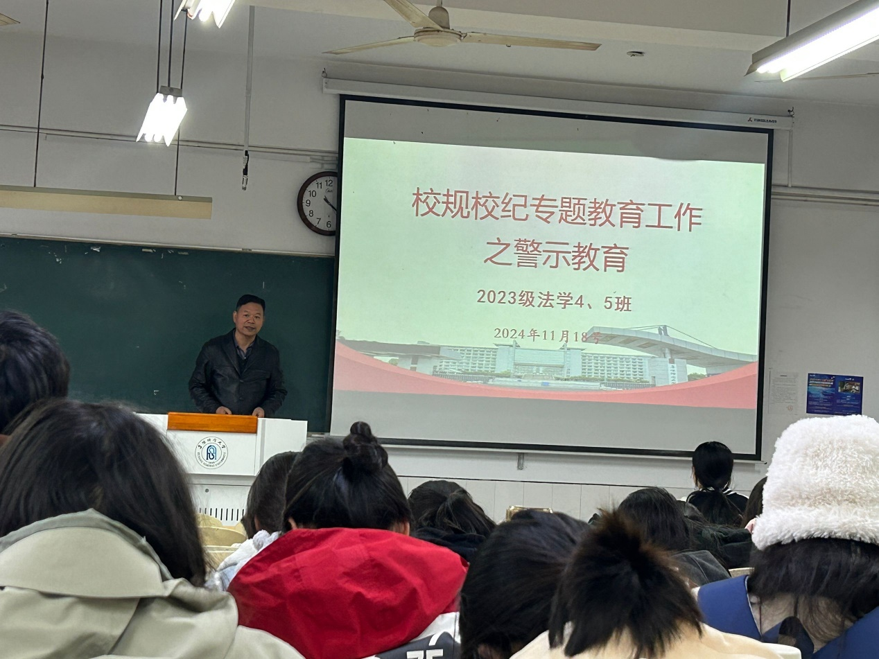 为进一步加强对大学生进行校规校纪教育,引导大学生不断增强规则意识、责任意识和自律意识,优化校园育人环境,2023级法学4班、5班分别于11月7日、11月18日召开校规校纪教育主题班会,加强对大学生进行纪律教育。