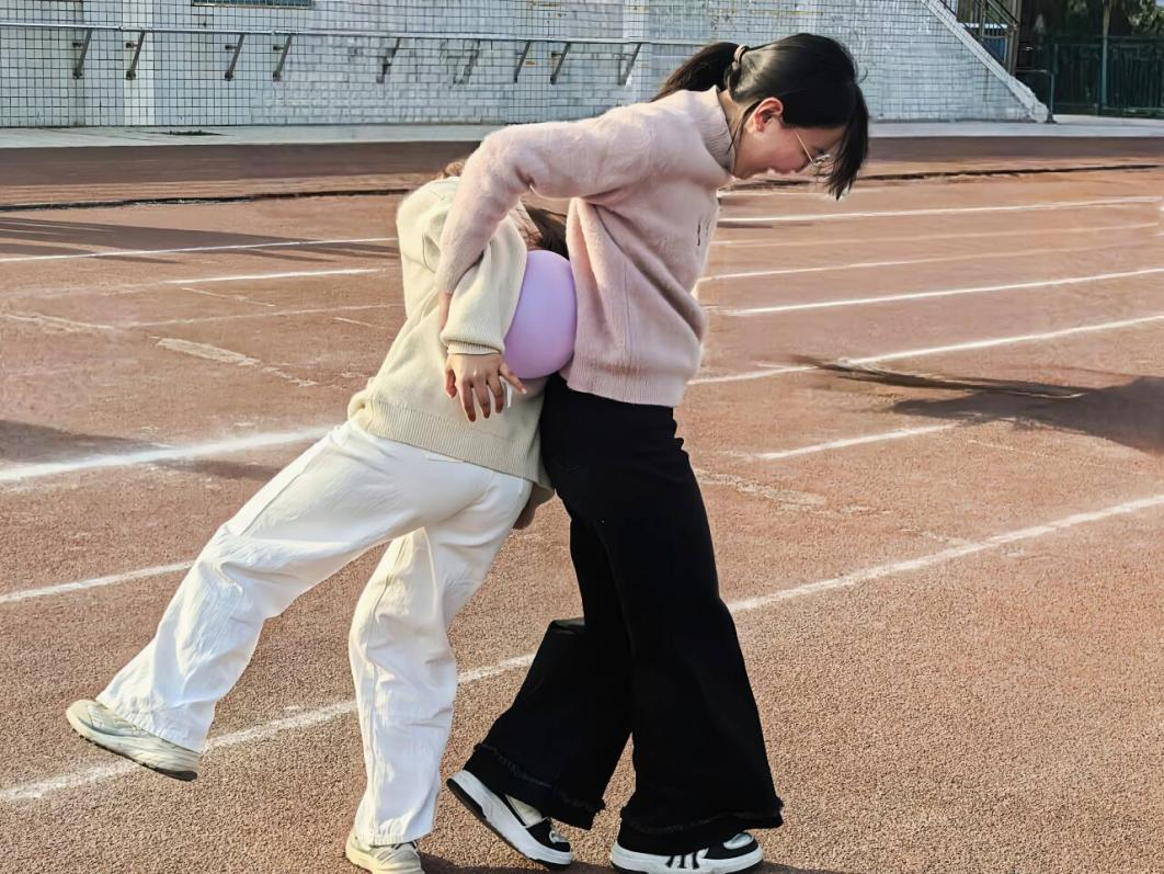 突破阻碍--体能挑战赋能压力转化。“携手奋进,风驰电掣——趣味接力”环节巧妙设置“大象转圈”“背夹气球”“筷子运球”三重关卡。学生们在克服身体失衡、协作失误等挑战时,展现出从慌乱到默契的转变。例如“背夹气球”环节中,参与者需调整呼吸节奏与步伐频率,这一过程恰似压力情境下的自我调适训练,通过适度体能挑战释放内啡肽缓解焦虑,而协作性障碍突破更能强化心理韧性。