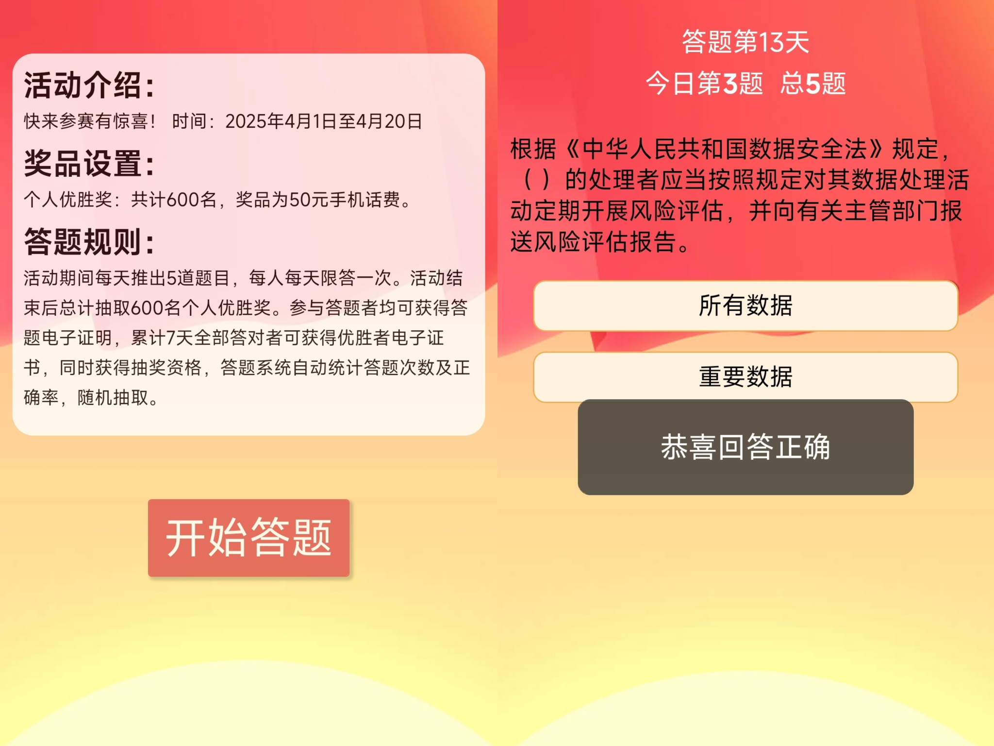 活动重点围绕学习宣传《中华人民共和国国家安全法》《反分裂国家法》《中华人民共和国核安全法》《中华人民共和国反恐怖主义法》《中华人民共和国反间谍法》《中华人民共和国网络安全法》《中华人民共和国生物安全法》《中华人民共和国数据安全法》等法律知识进行答题,进一步提升了广大师生维护国家安全的意识,营造了尊法、学法、守法、用法的良好氛围。