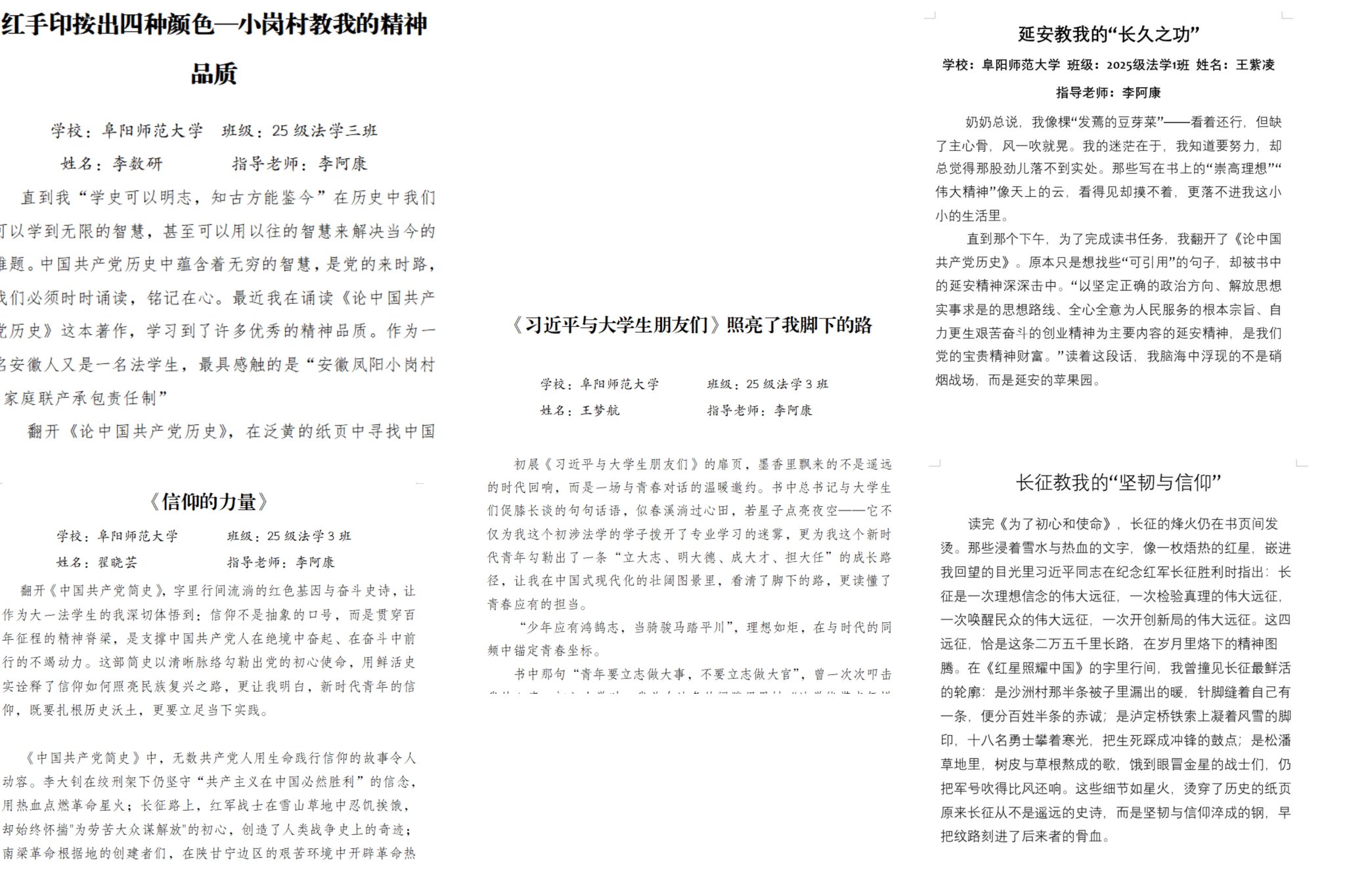 部分作品紧扣《论中国共产党历史》中的故事,讲述如何从党史中汲取法治建设的精神养分;有的作品围绕《习近平与大学生朋友们》,表达了向习近平总书记学习、扎根基层服务群众的决心。活动开展以来,共收到作品40余篇,经过筛选评审,10余篇作品获评优秀读书感悟。接下来,学院将在不同平台进行展示并择优上报,让更多同学在交流中收获成长。